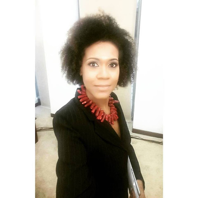 She's office chi with a pinstripe suit and a superb ethnic neck piece